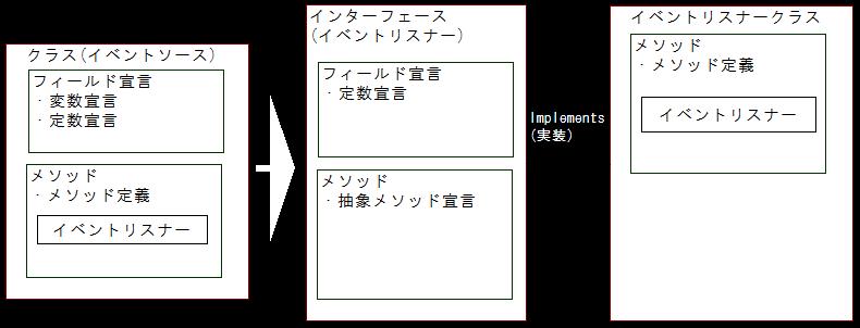 ActionListenerインタフェースを実装したイベントリスナークラスの構造は次の図のとおりです。