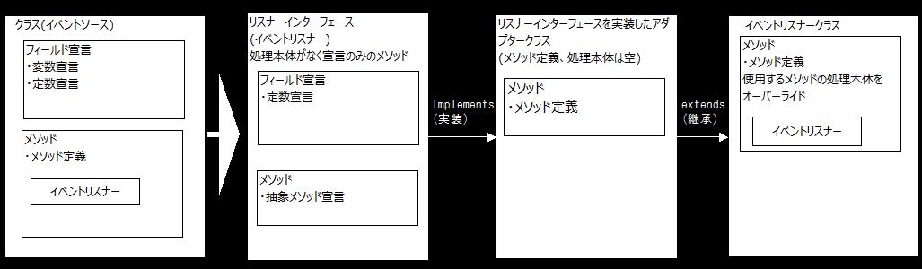 イベントソースとリスナーインタフェースを実装したアダプタークラスを継承したイベントリスナークラスの構造は次の図のとおりです。